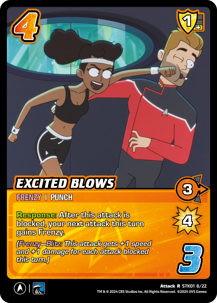 If your card has a blue text box it’s an Action card! Actions must be played from your hand on the specific step they show: for example, an Action card that says “Enhance” must be played during the Enhance step, whether it’s yours or your opponent’s. Action cards work great as “surprises” that can shift the flow of combat in your favor.