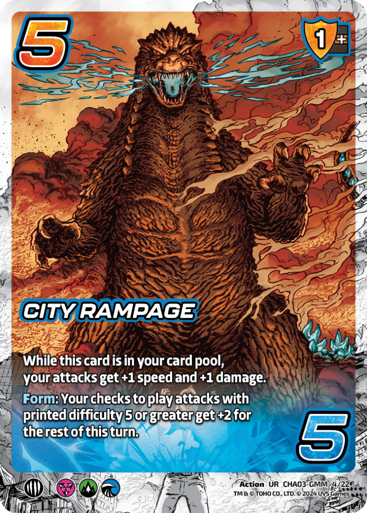 Since the release of the Godzilla challenger deck, City Rampage has been the backbone of the “5 difficulty or greater” attack package. While new attacks would come and go for the strategy, City Rampage was a constant. Now that Godzilla: Reign of Kaiju is out in the world, there are more characters and cards supporting the 5 diff playstyle than ever. With that in mind we think it’s time to adjust some of the explosiveness of early game City Rampage. Combined with some of the powerful new tools available to the strategy, we are seeing games end faster than we’d like. This errata should slow it down early, especially in multiples.