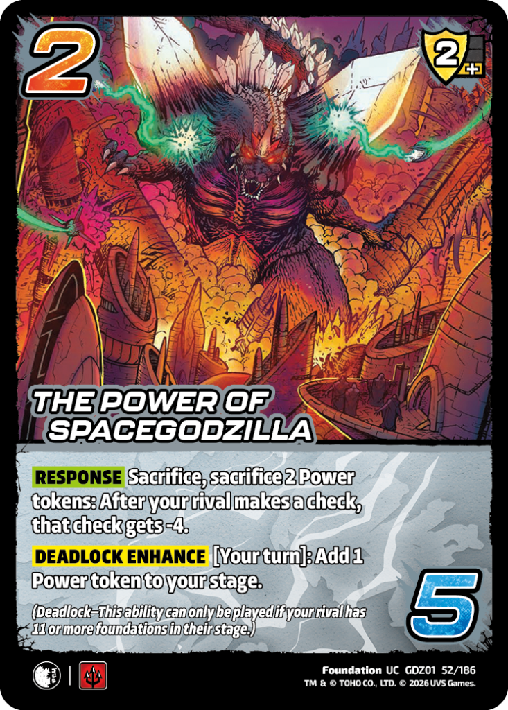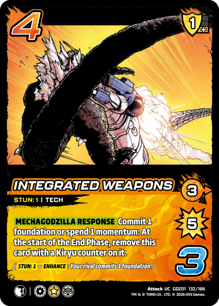 NEW: Mechagodzilla Response [Card pool] Commit 1 foundation or spend 1 momentum: At the start of the End Phase, remove this card with a Kiryu counter on it.