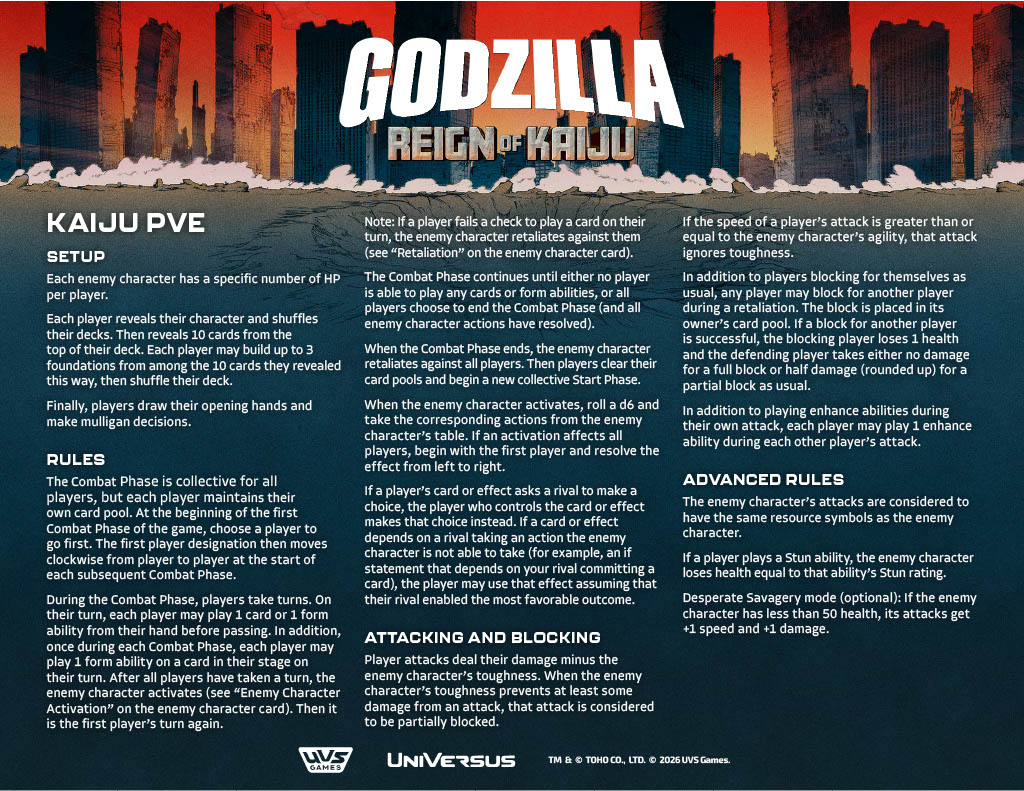 Greeting UniVersus and Godzilla fans! We are here to share some exciting information about upcoming PVE experiences you’ll be able to find right here on our website. These experiences are part of the release of Godzilla: Reign of Kaiju, and they will be available to everyone to try out as they release! This means every few weeks you’ll have a new PVE experience to try alongside your brand new Godzilla: Reign of Kaiju cards!